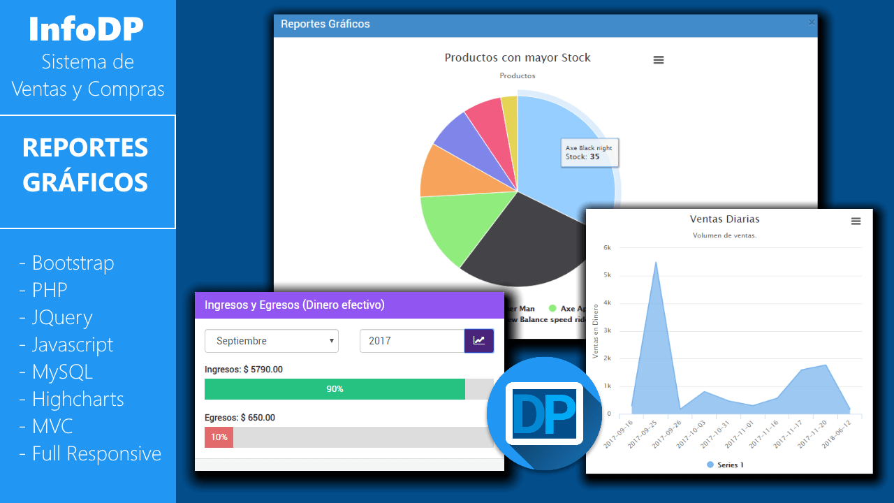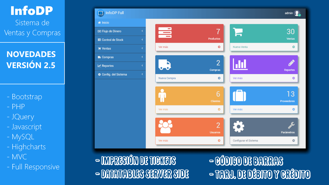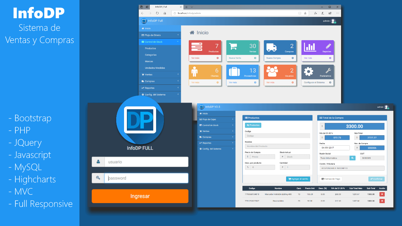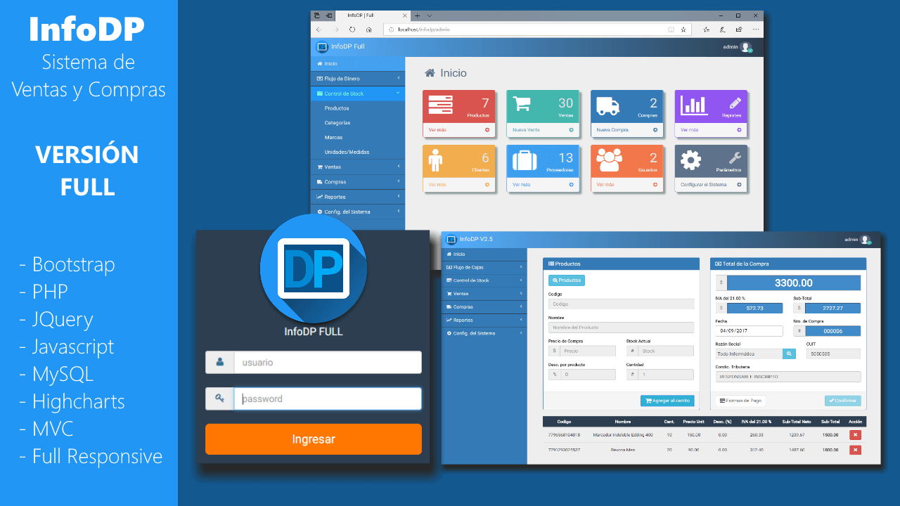 En todos los casos se entrega: código fuente, script base de datos MysQL, Módulo control de stock, Módulo Flujo de cajas, Módulos de Ventas y Compras, y Configuración del sistema.