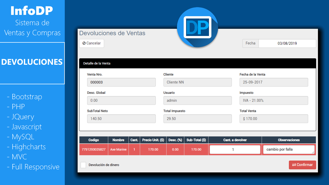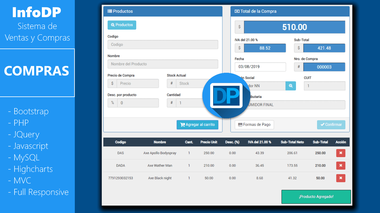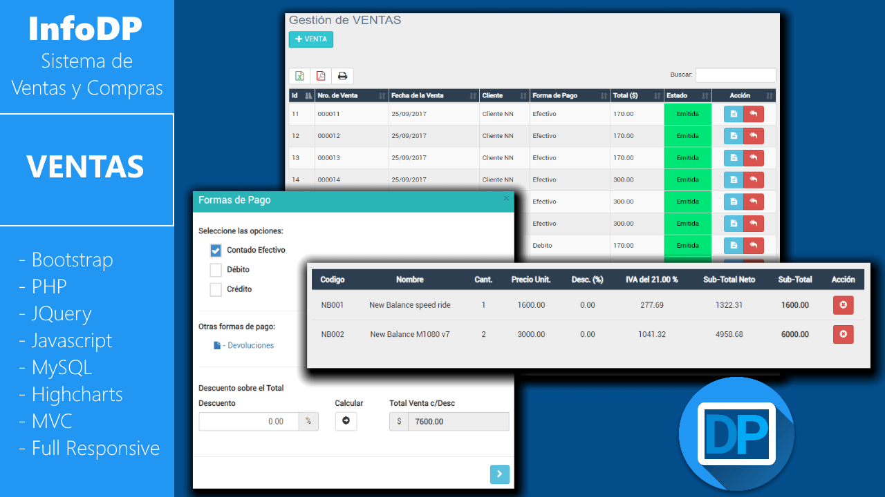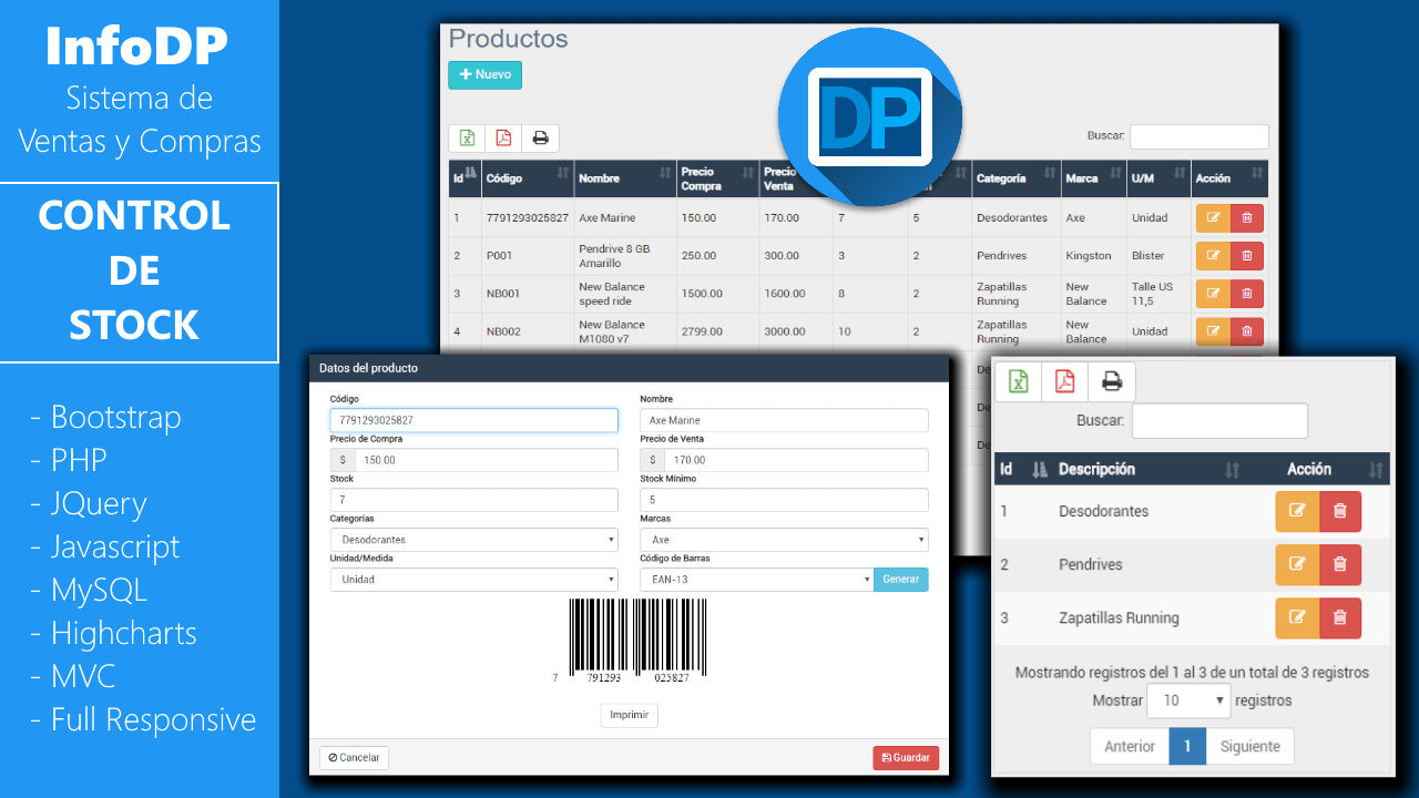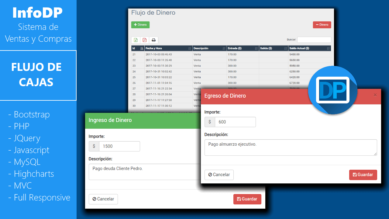 En todos los casos se entrega: código fuente, script base de datos MysQL, Módulo control de stock, Módulo Flujo de cajas, Módulos de Ventas y Compras, y Configuración del sistema.